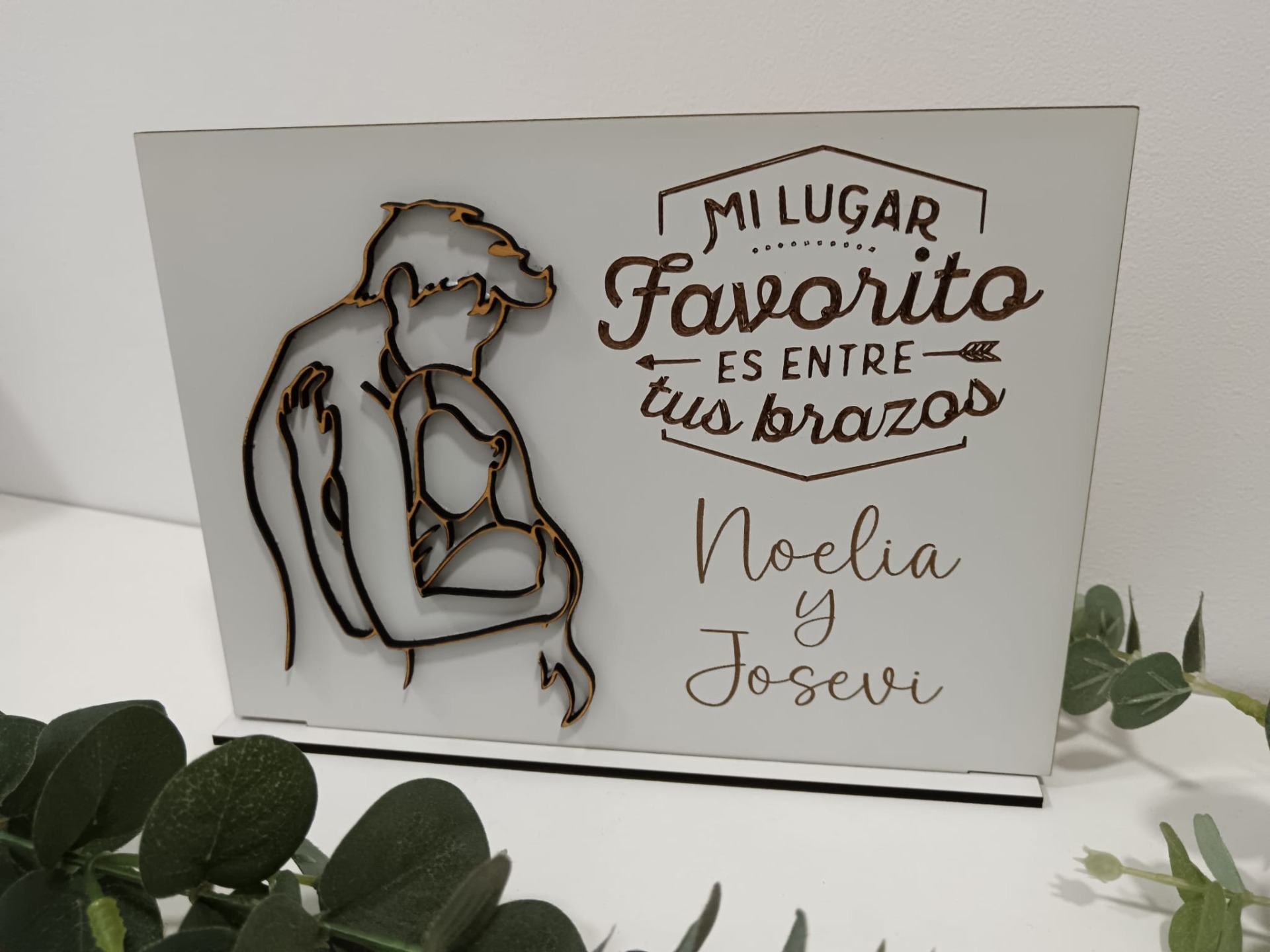 Lamina decorativa con la silueta del abrazo en madera, y con el grabado que elijas.