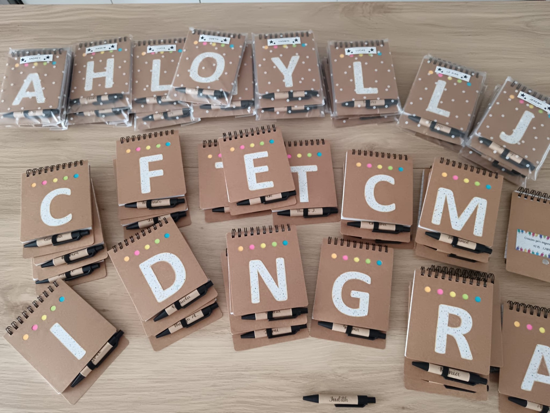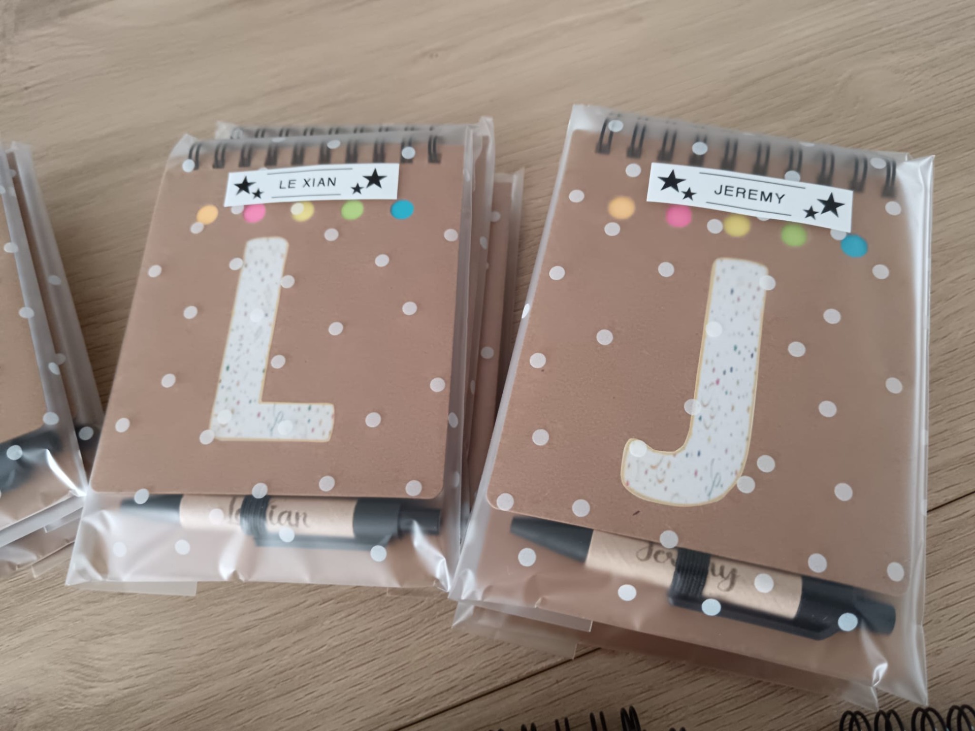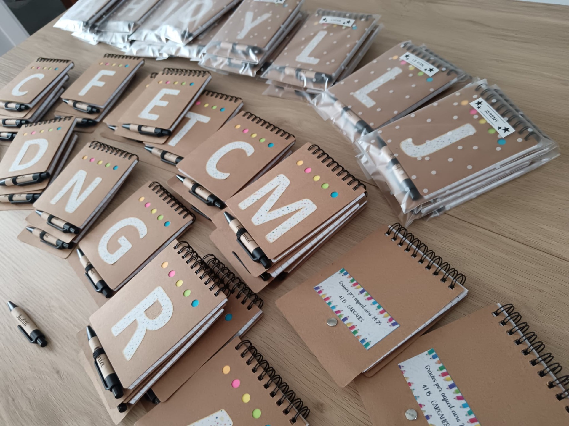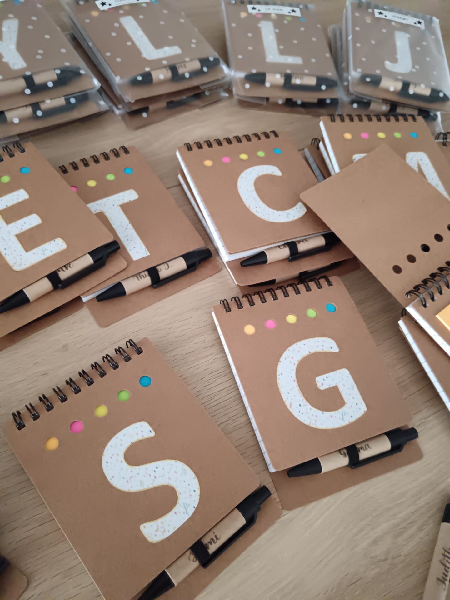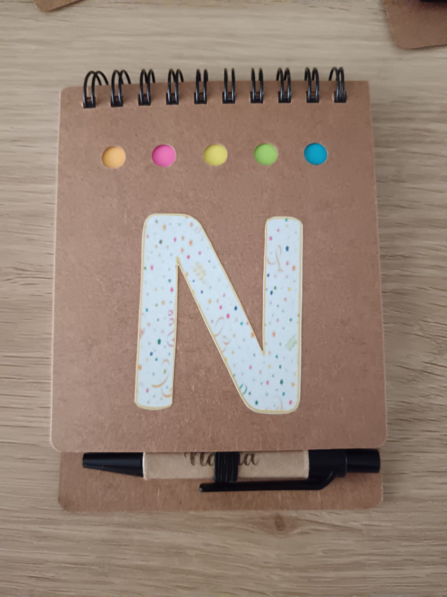 Libretitas en color kraft, con notas adhesivas y bolígrafo grabado con el nombre.