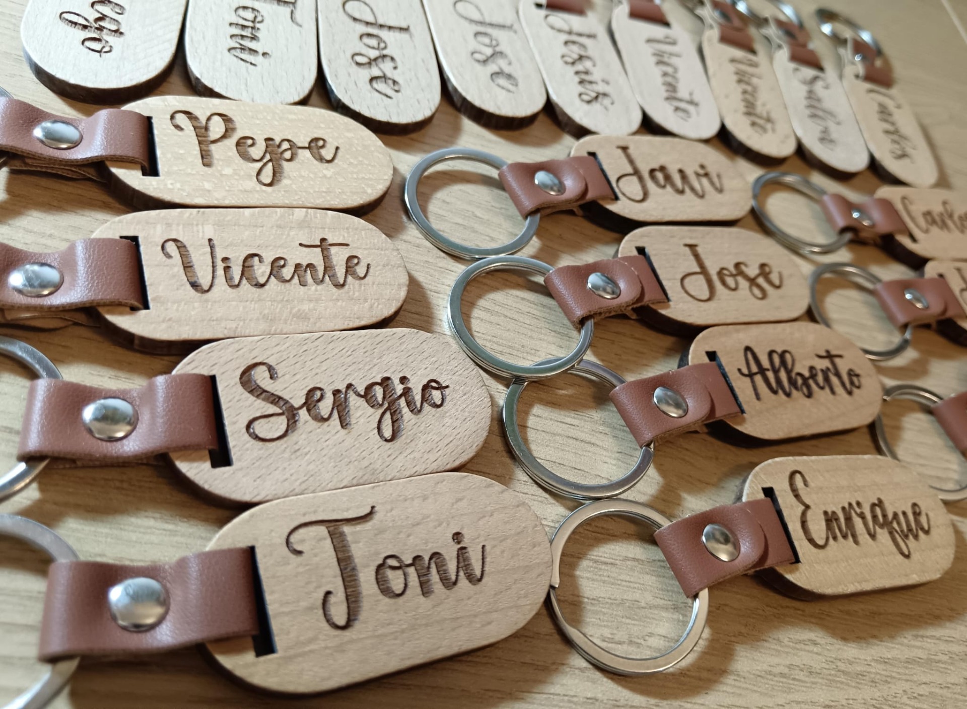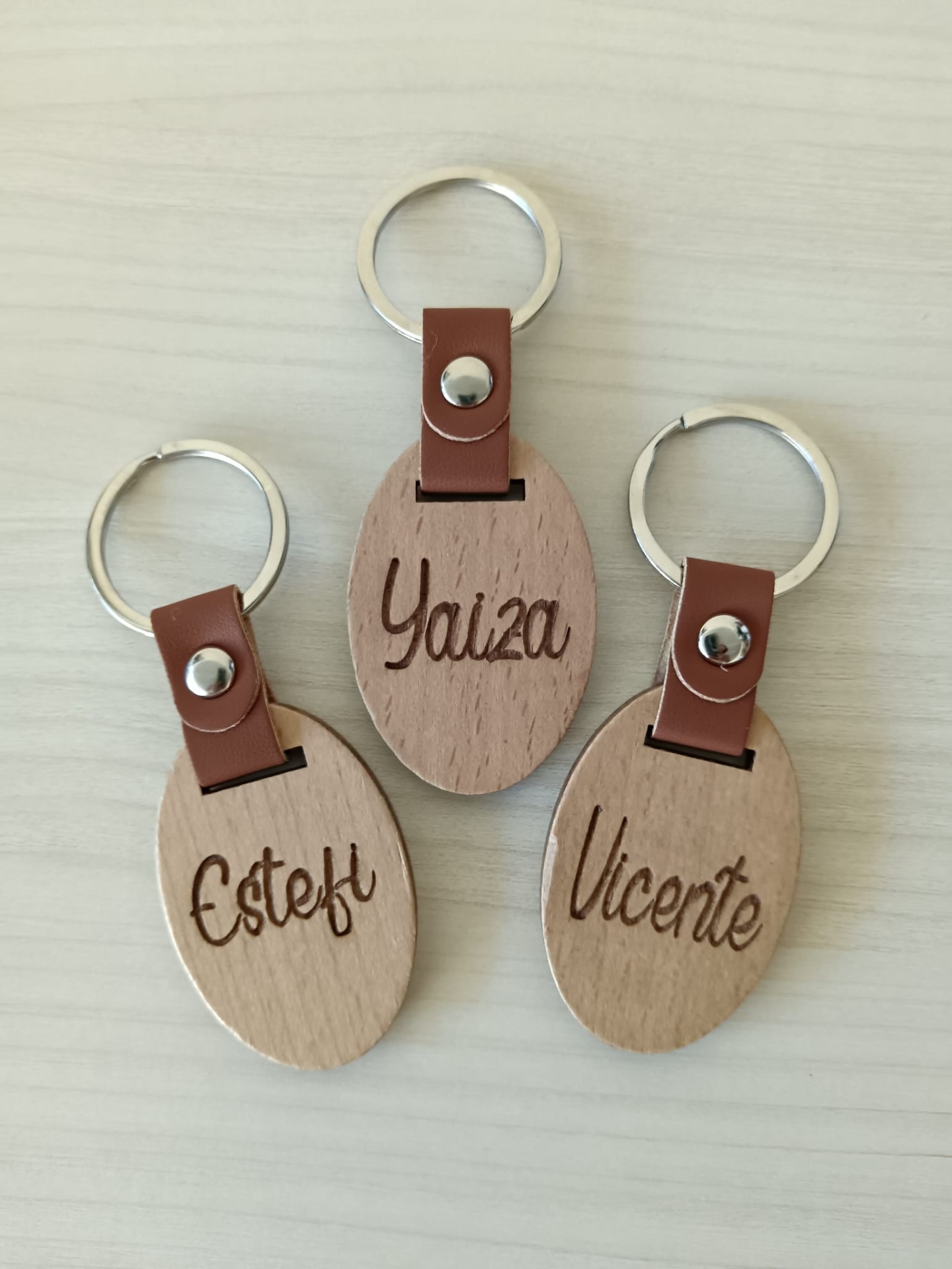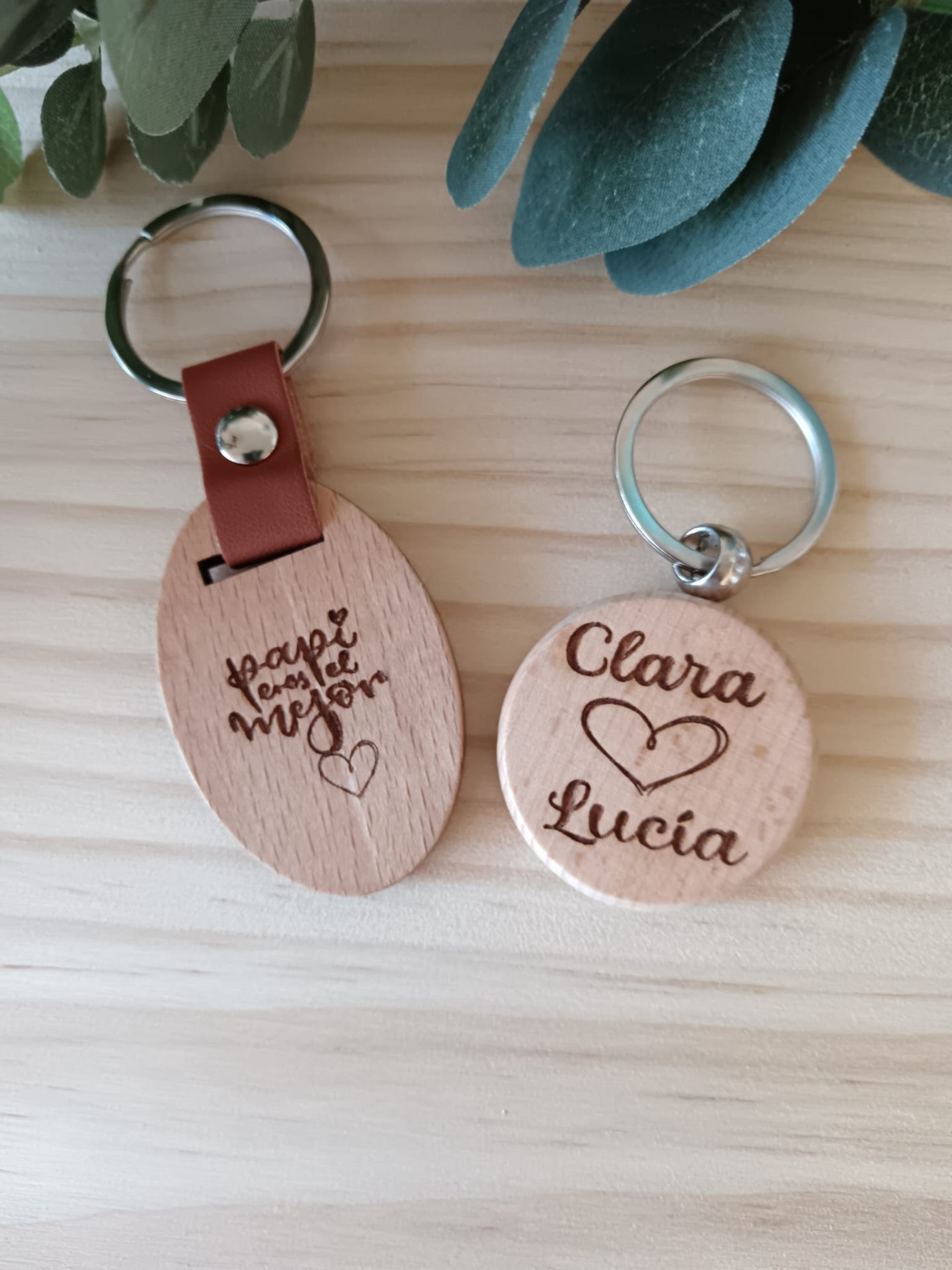 Estos llaveros de madera con tira de cuero, son perfectos para cualquier ocasión.