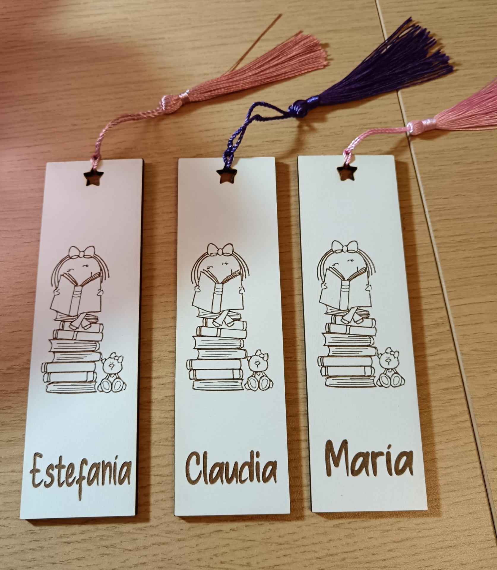 Ten un bonito detalle para los niñ@s con este marcapáginas personalizado con su nombre, dibujo y, borla de colores.