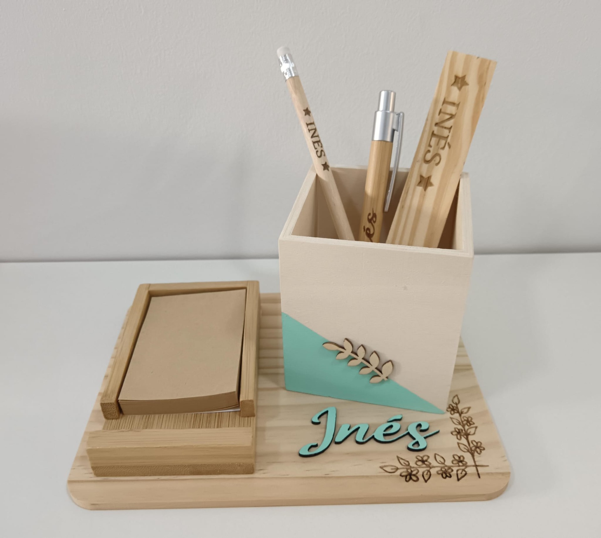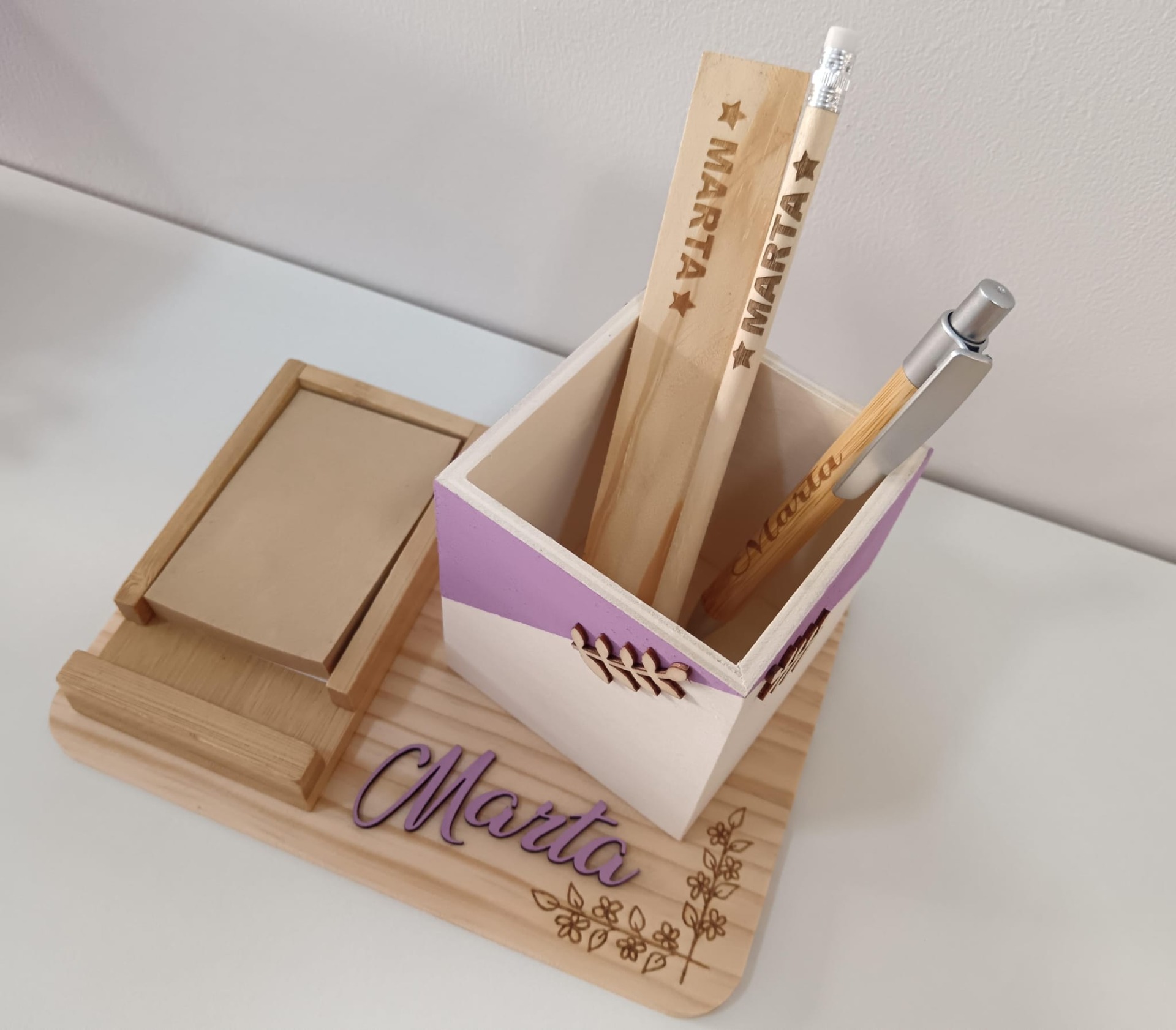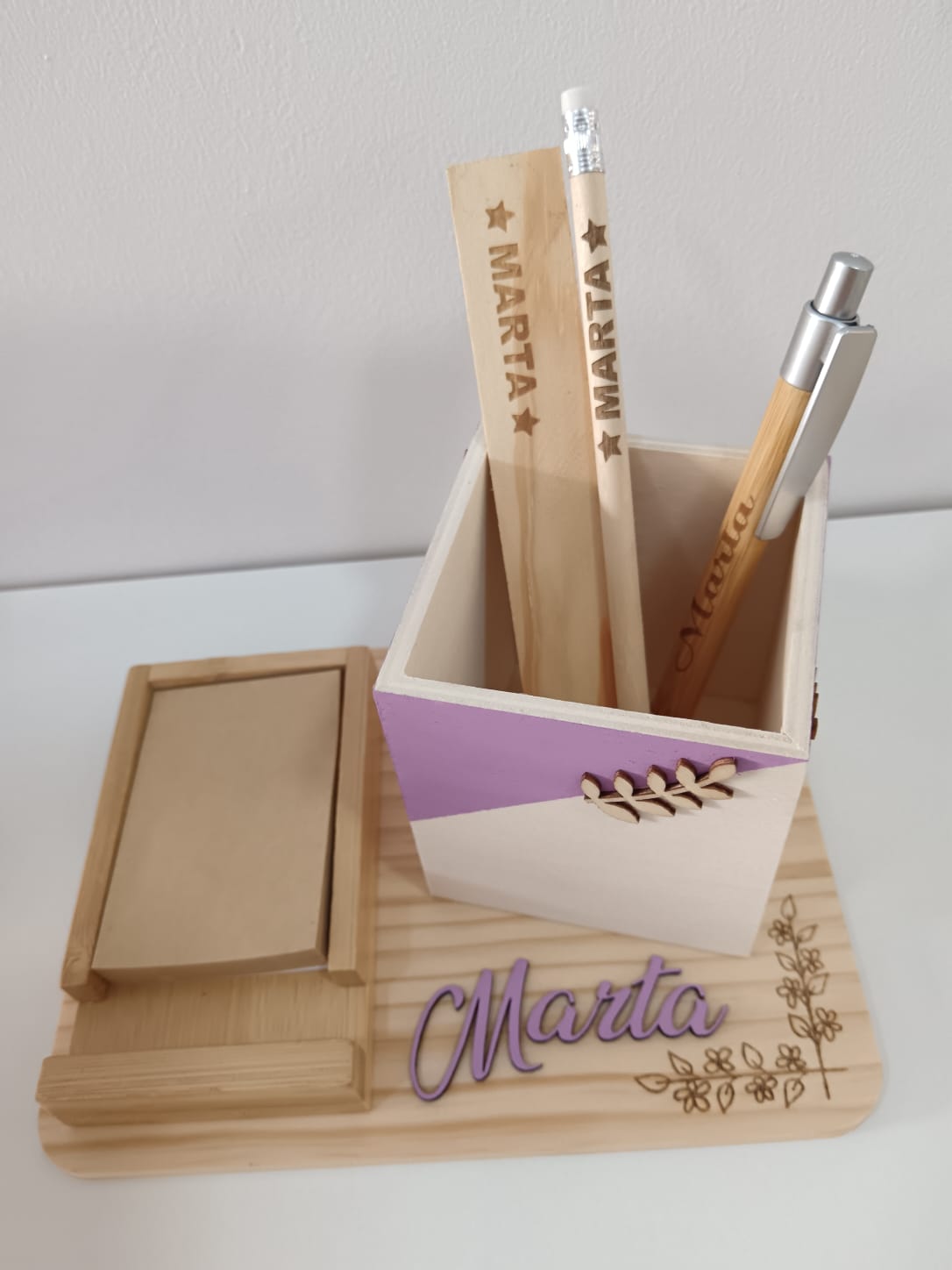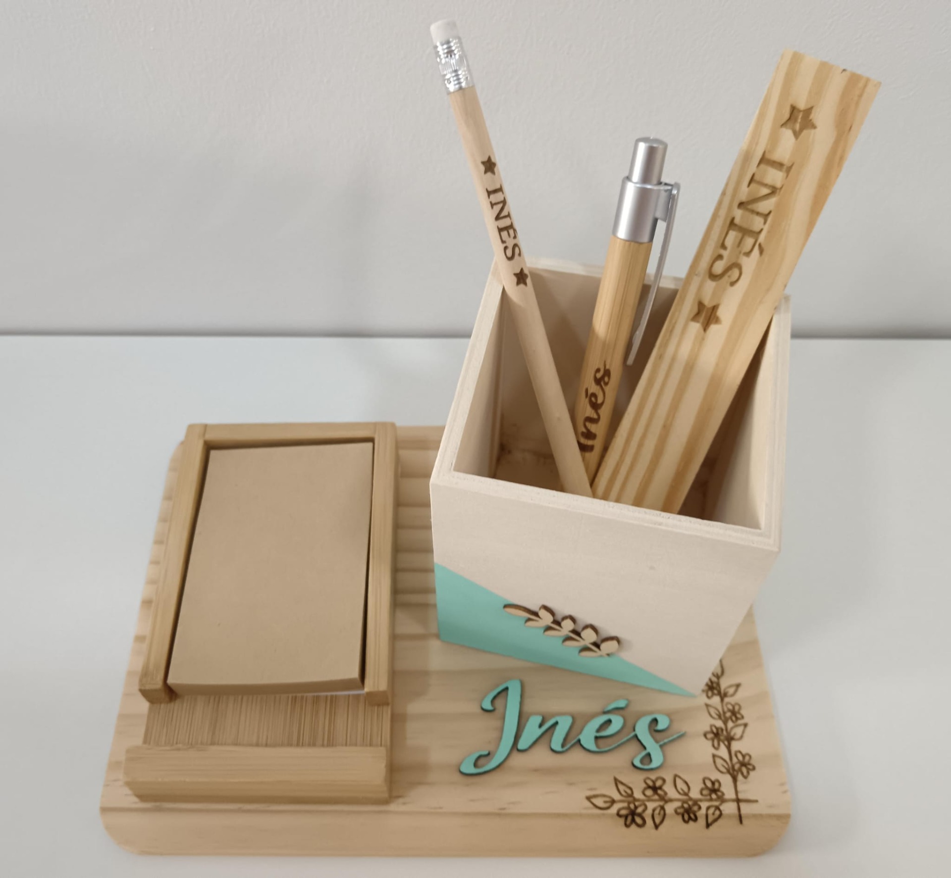 Consta de porta notas con soporte para el móvil, porta lápices con bolígrafo, lápiz y regla grabados con el nombre.