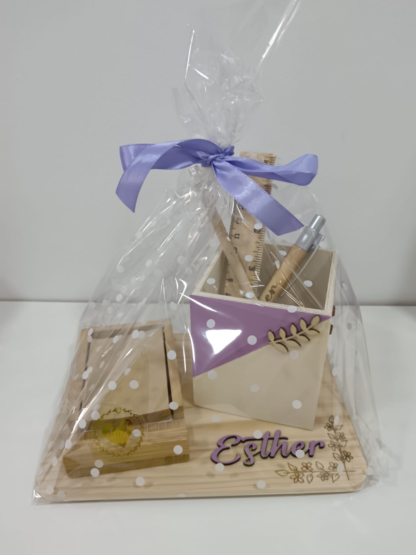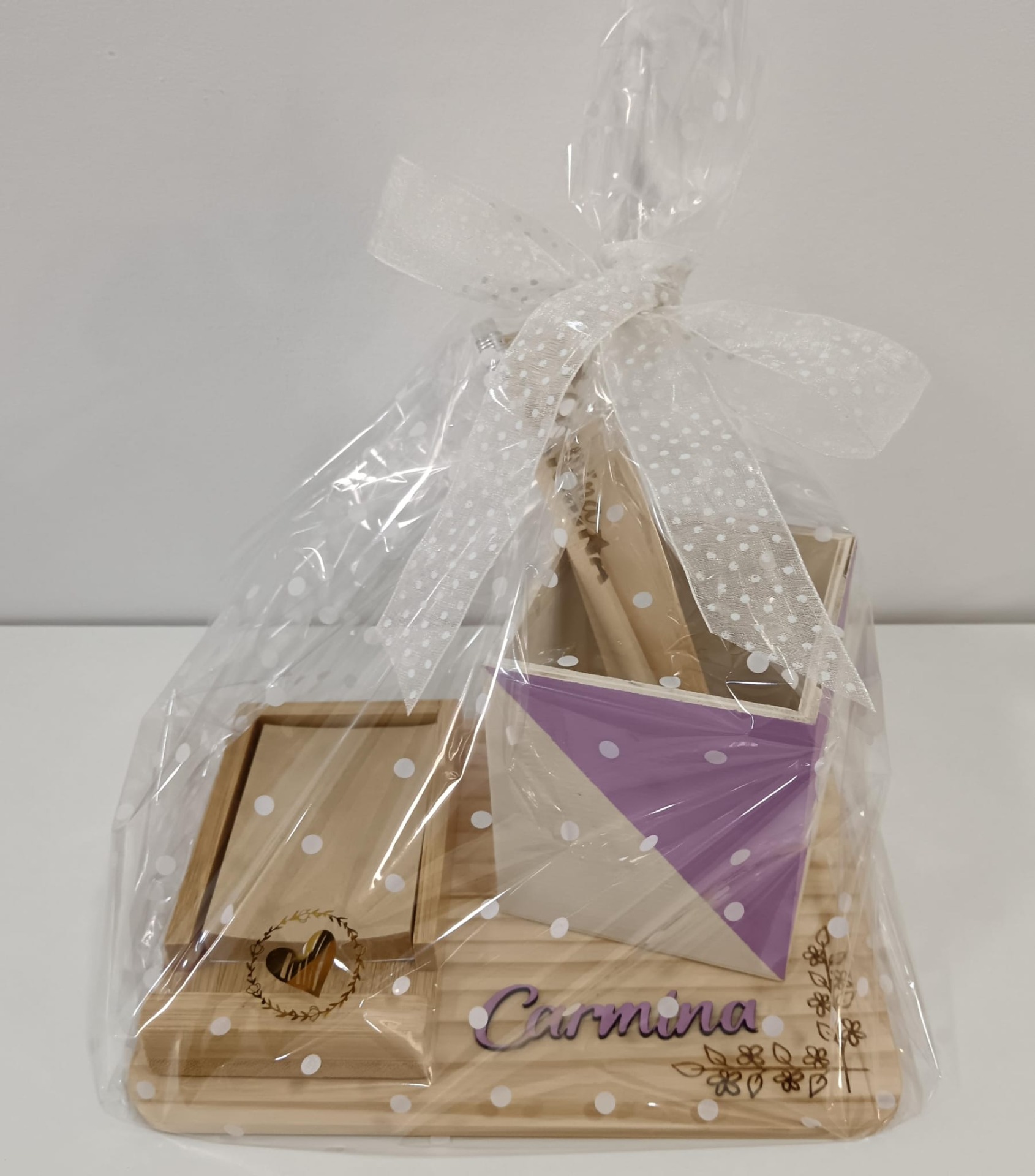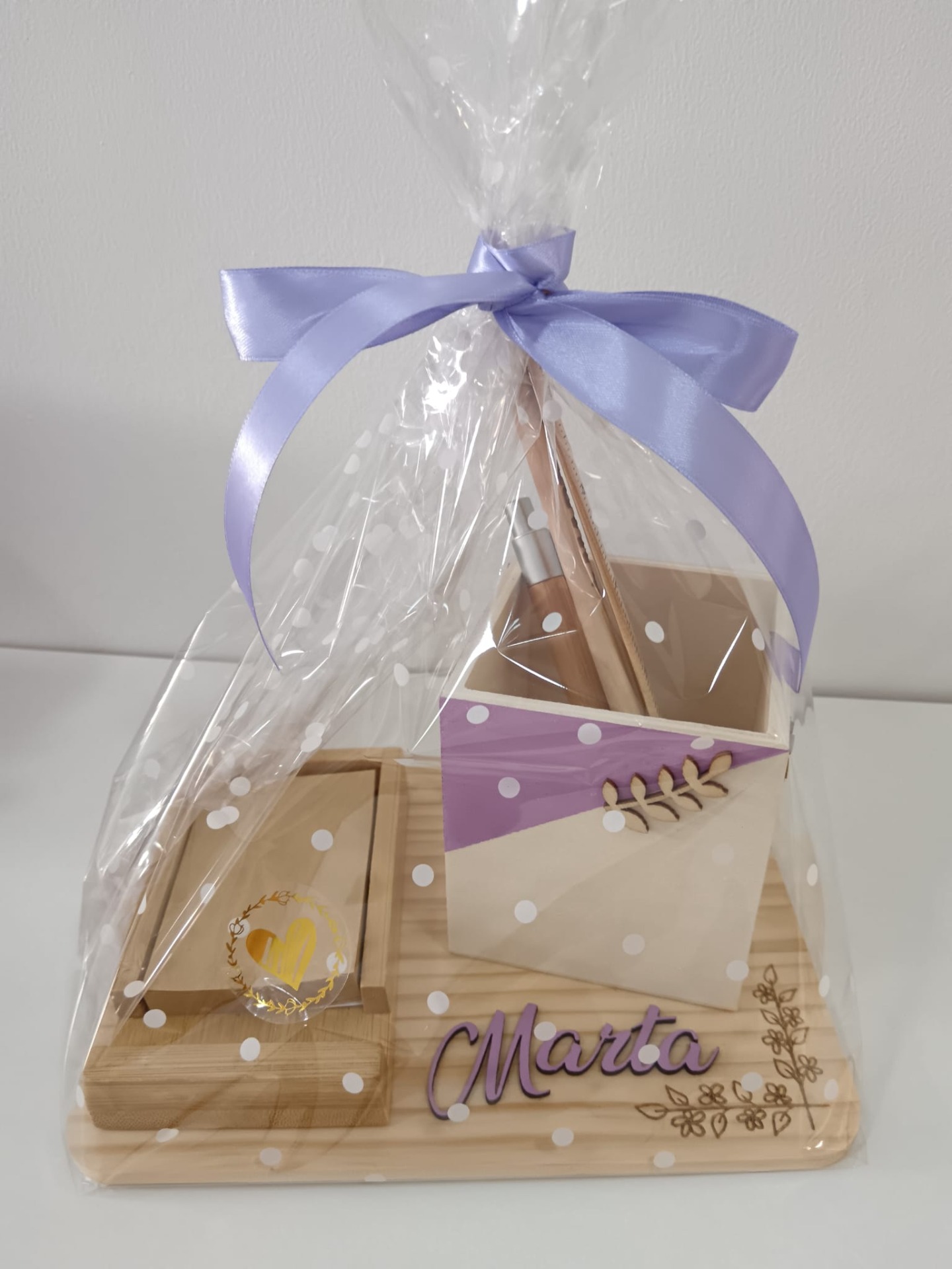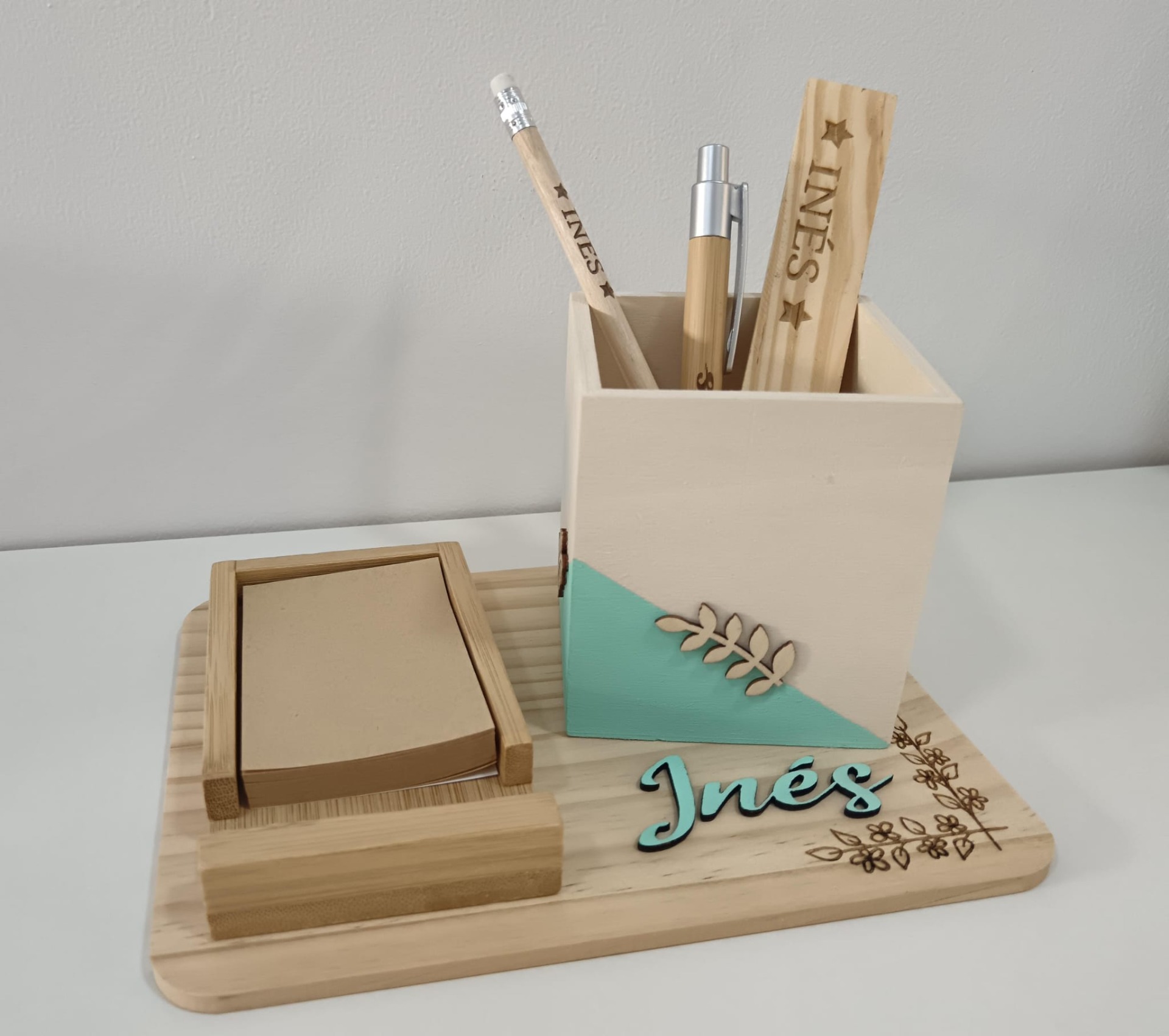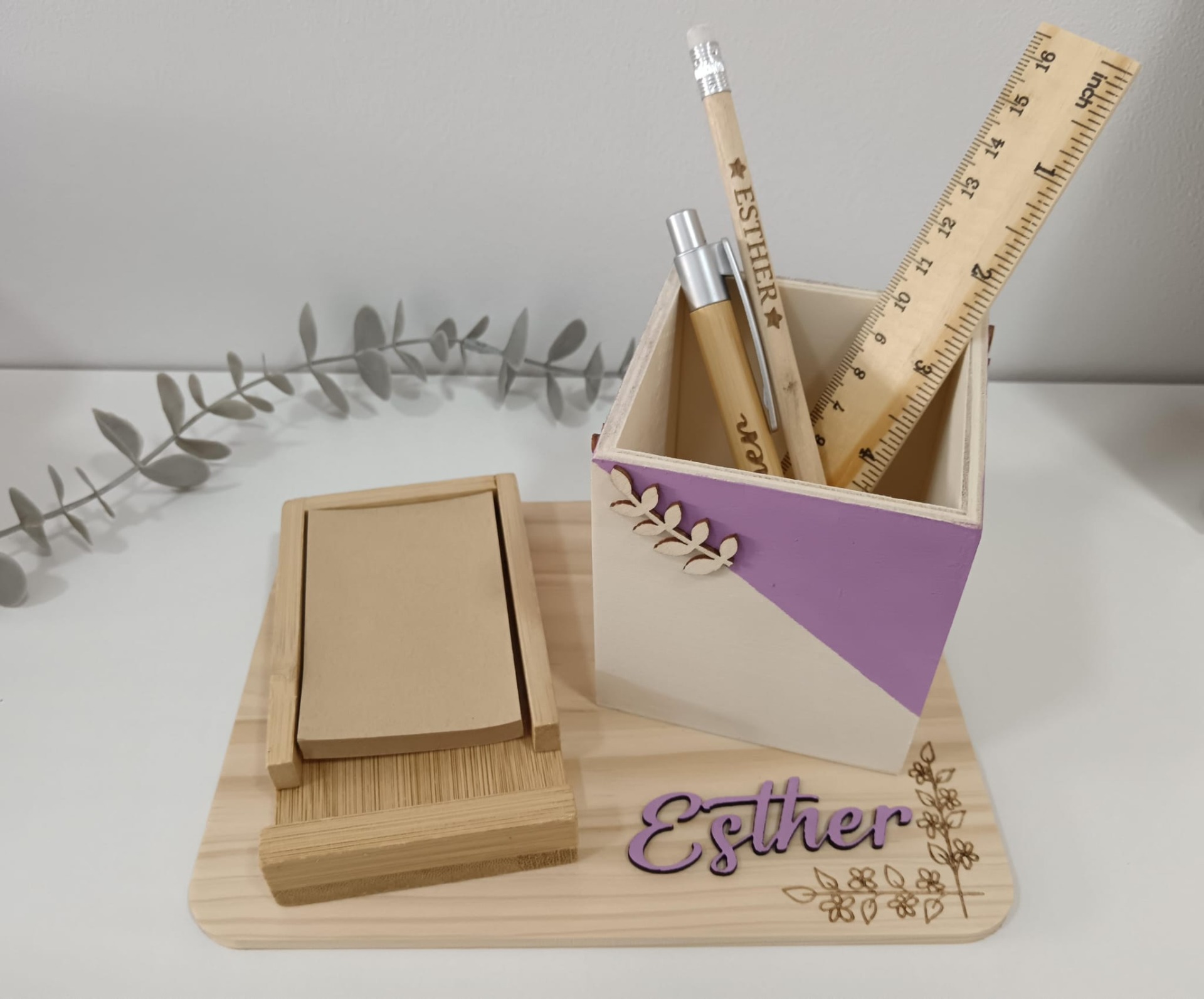 Consta de porta notas con soporte para el móvil, porta lápices con bolígrafo, lápiz y regla grabados con el nombre.