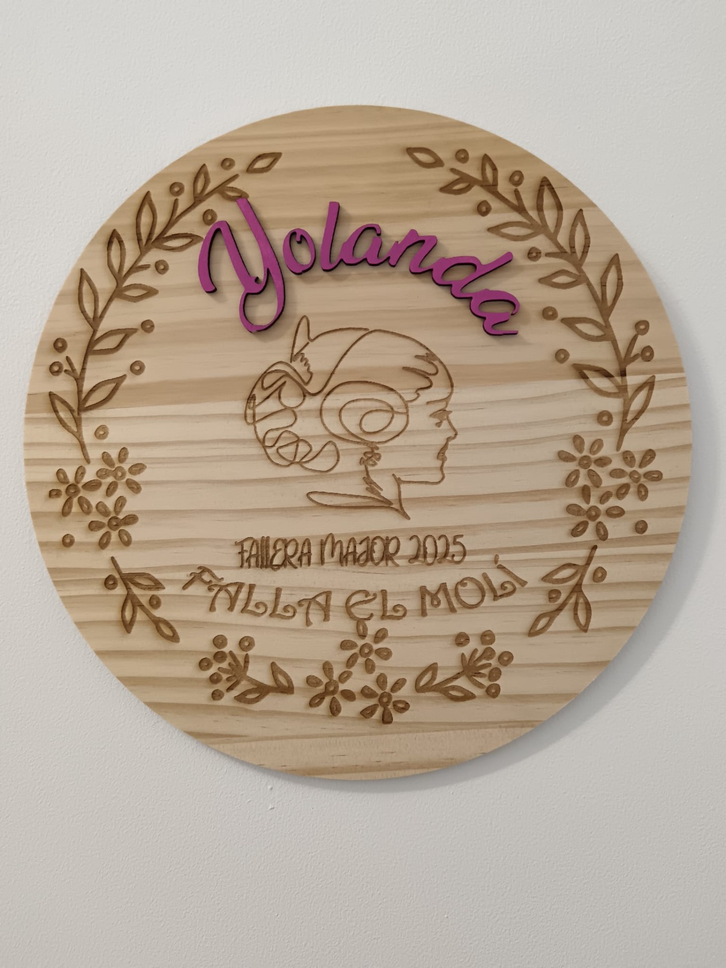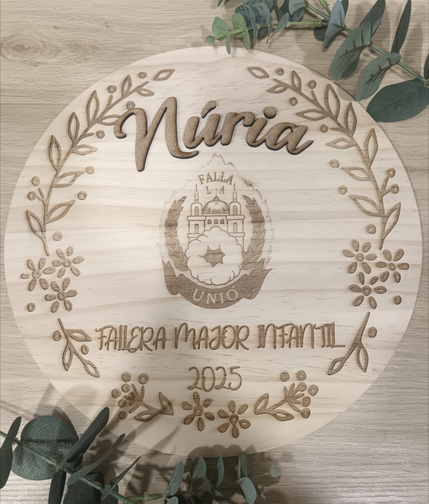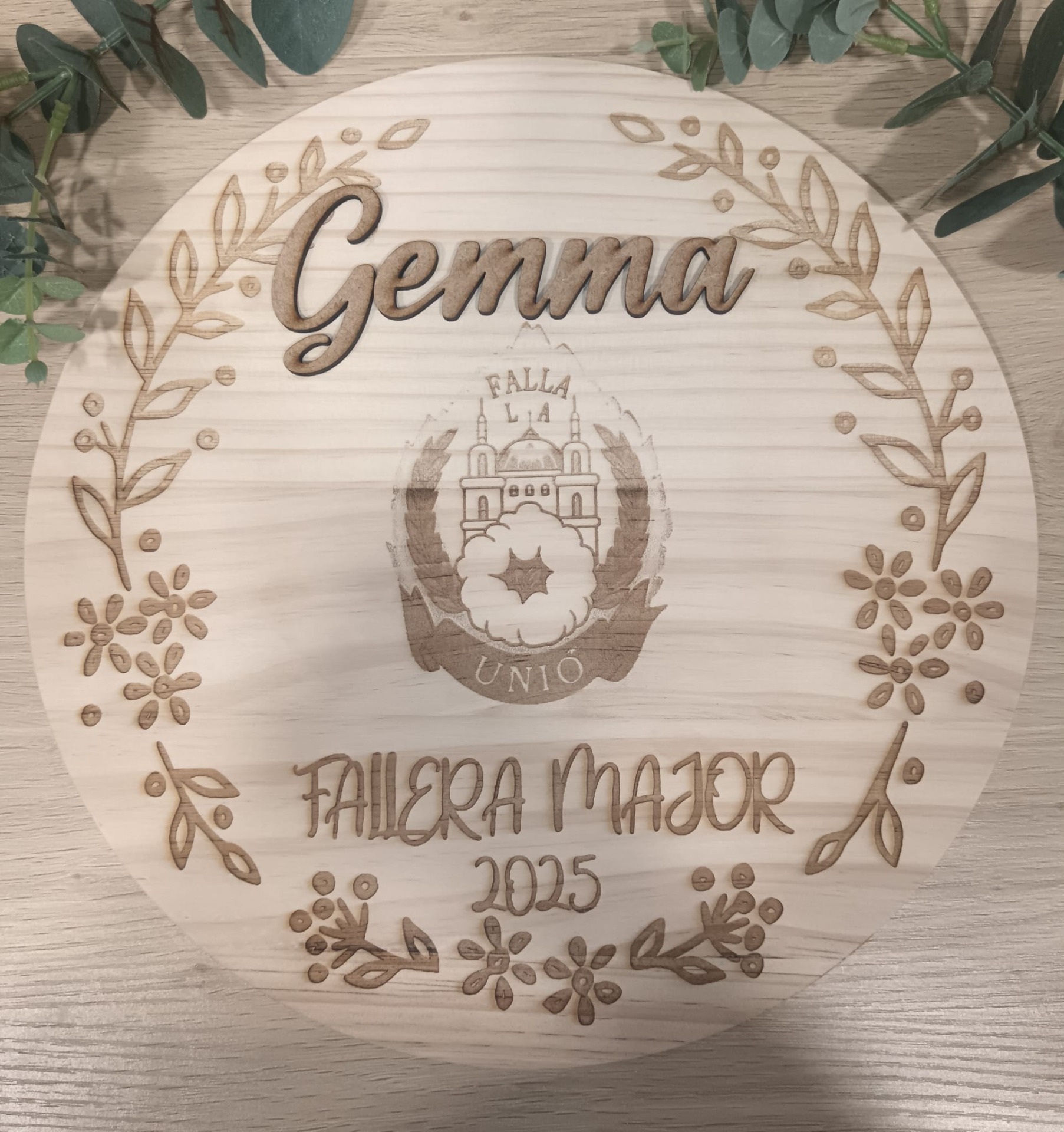 Placa de madera grabada a láser con el logo de tu falla o, el grabado que elijas. Con nombre en madera.