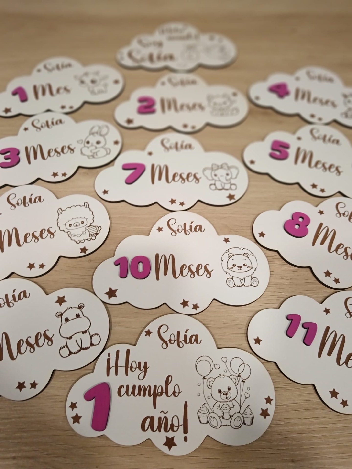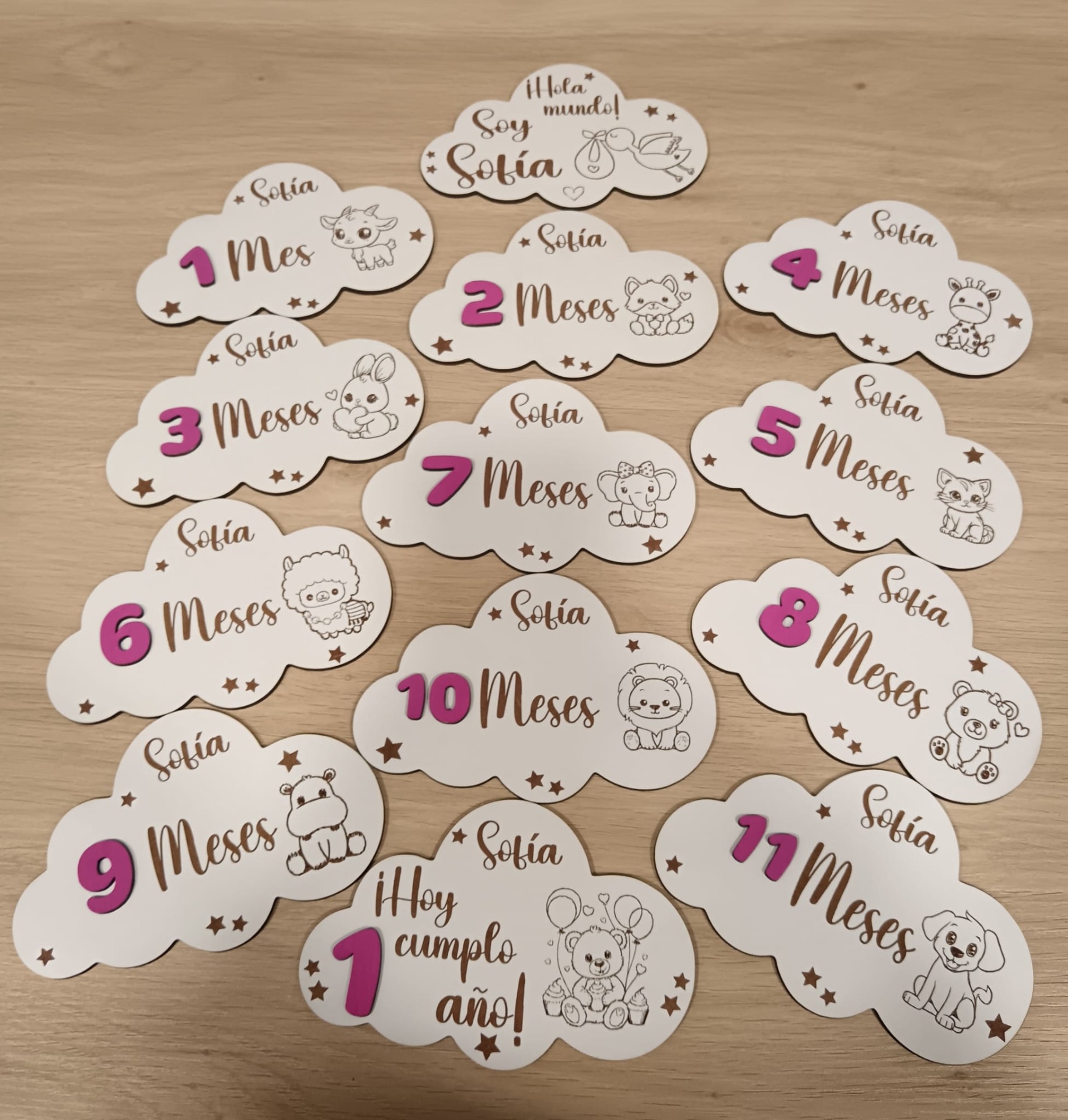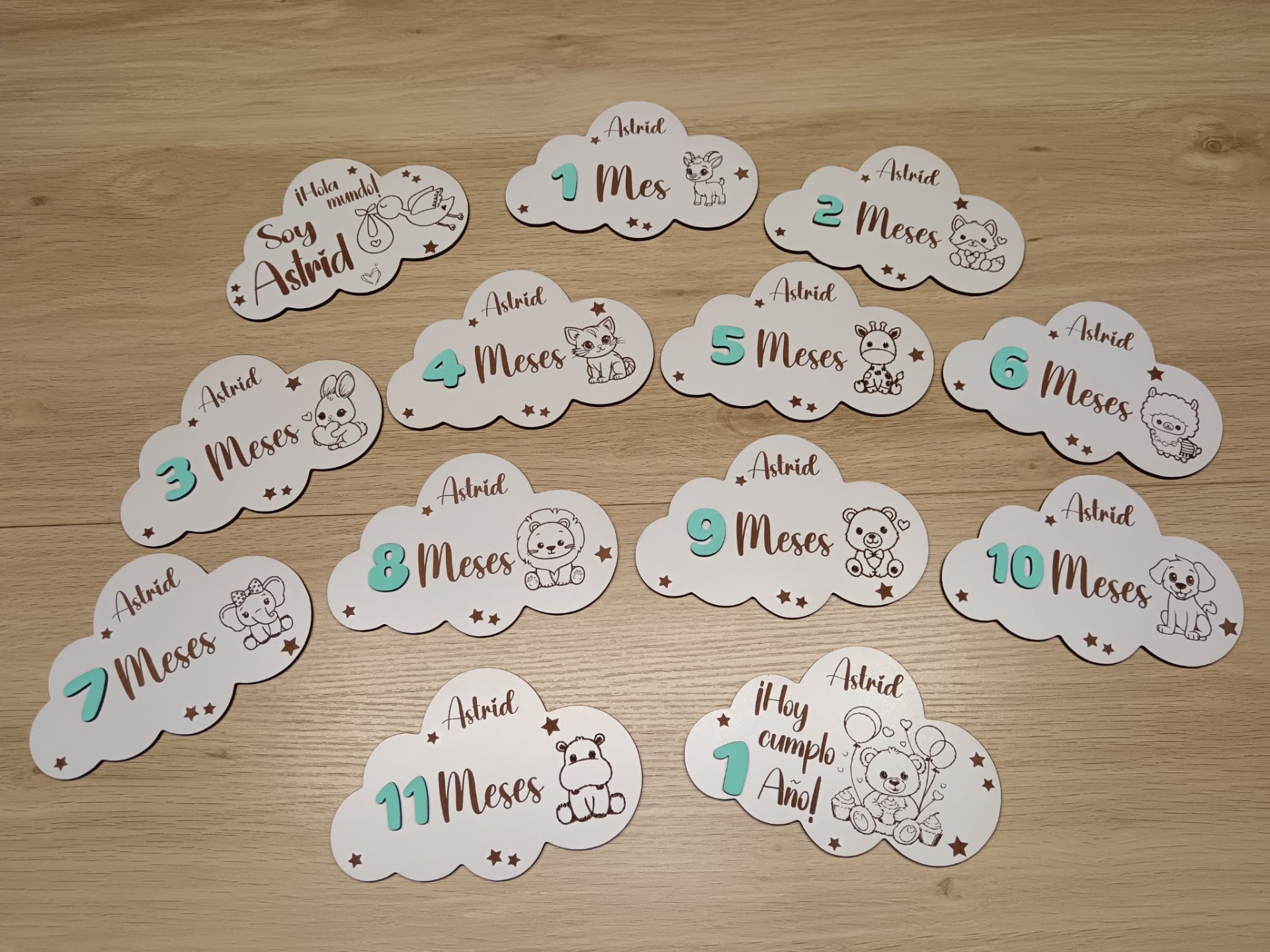 Placas Cumple mes, en forma de nube, para realizar las fotos mes a mes de tu bebé.