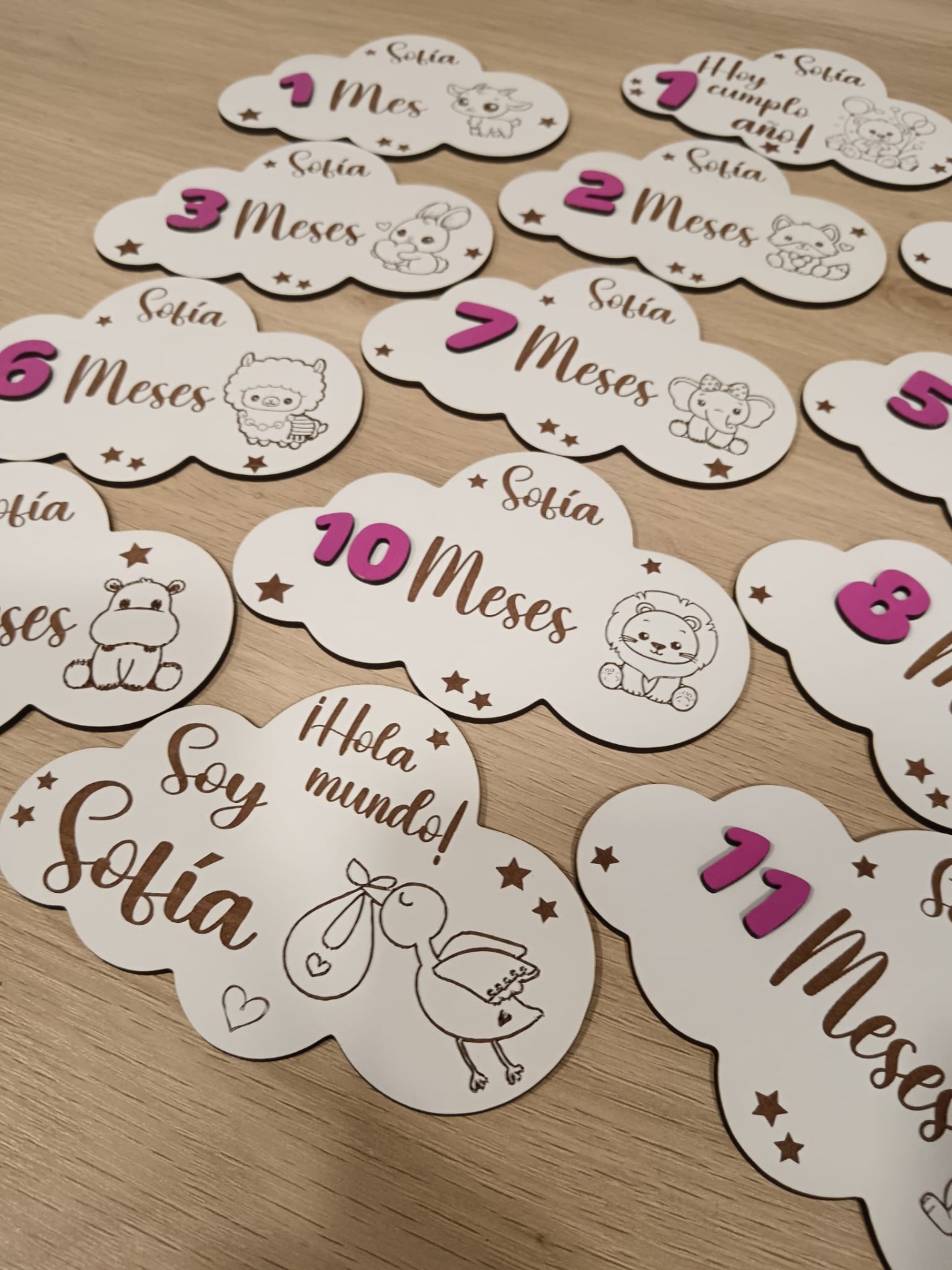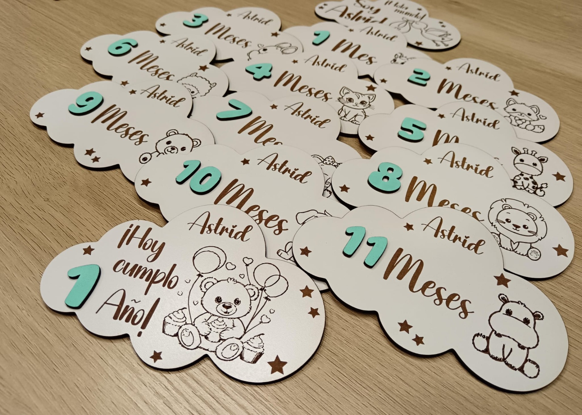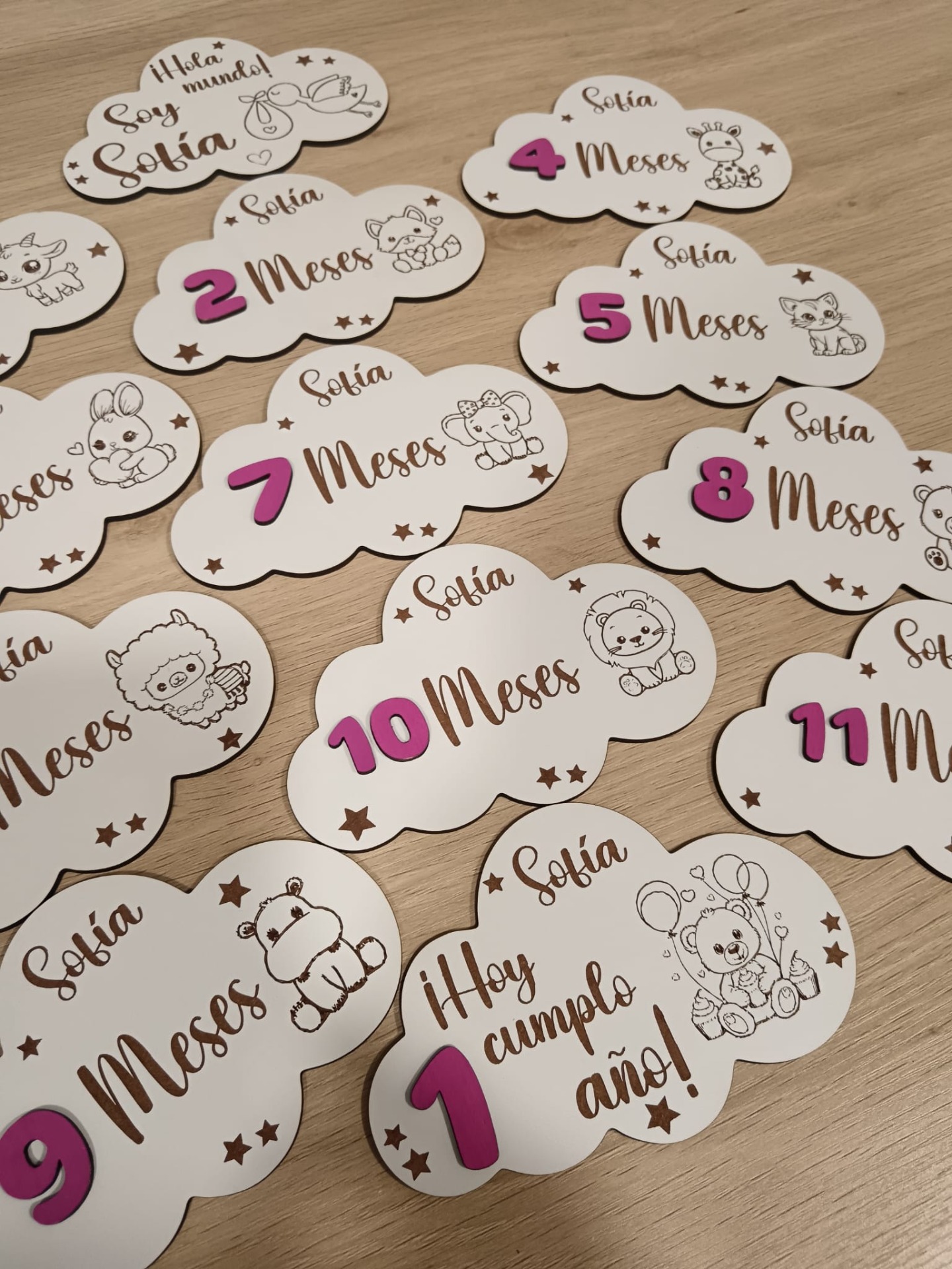Placas Cumple mes, en forma de nube, para realizar las fotos mes a mes de tu bebé.